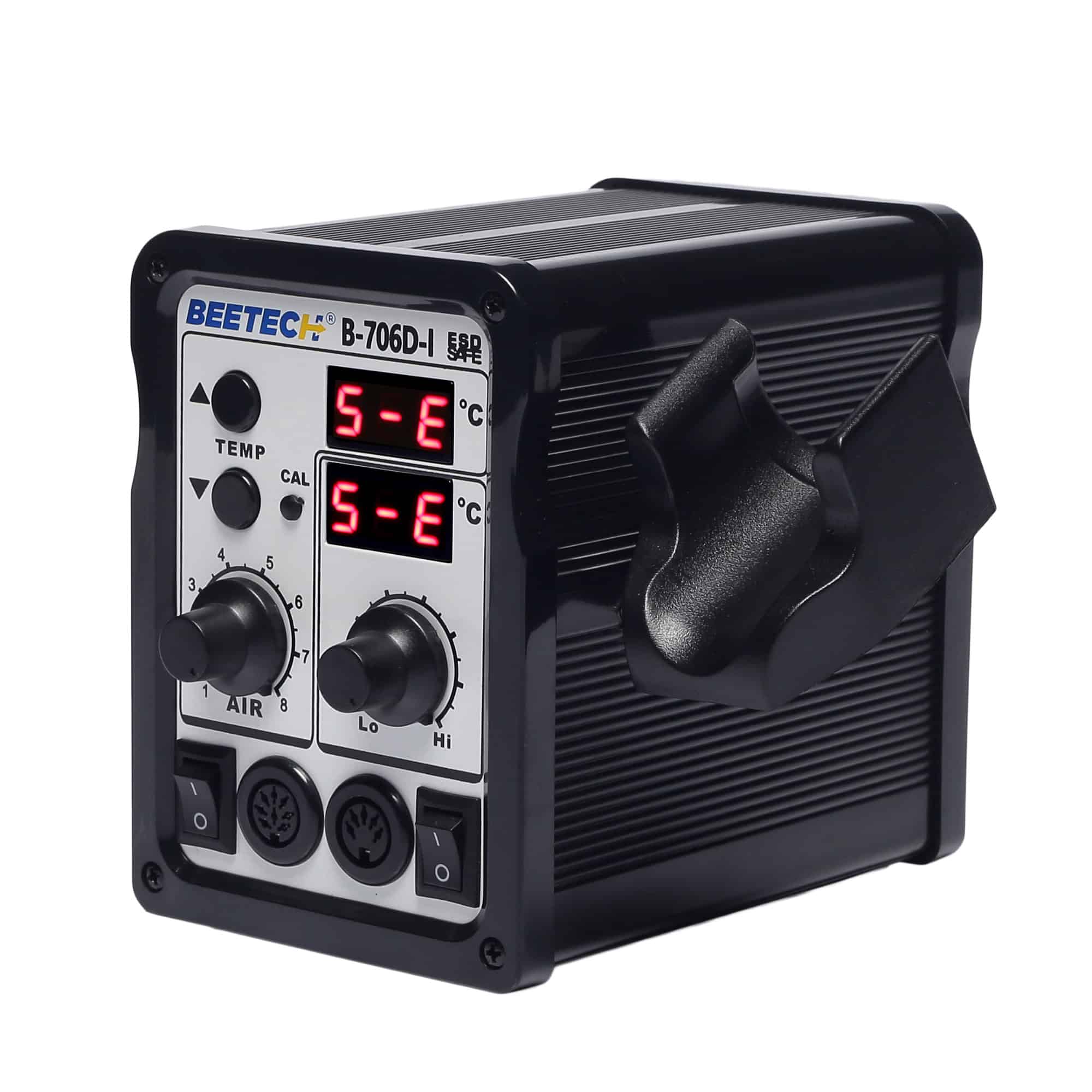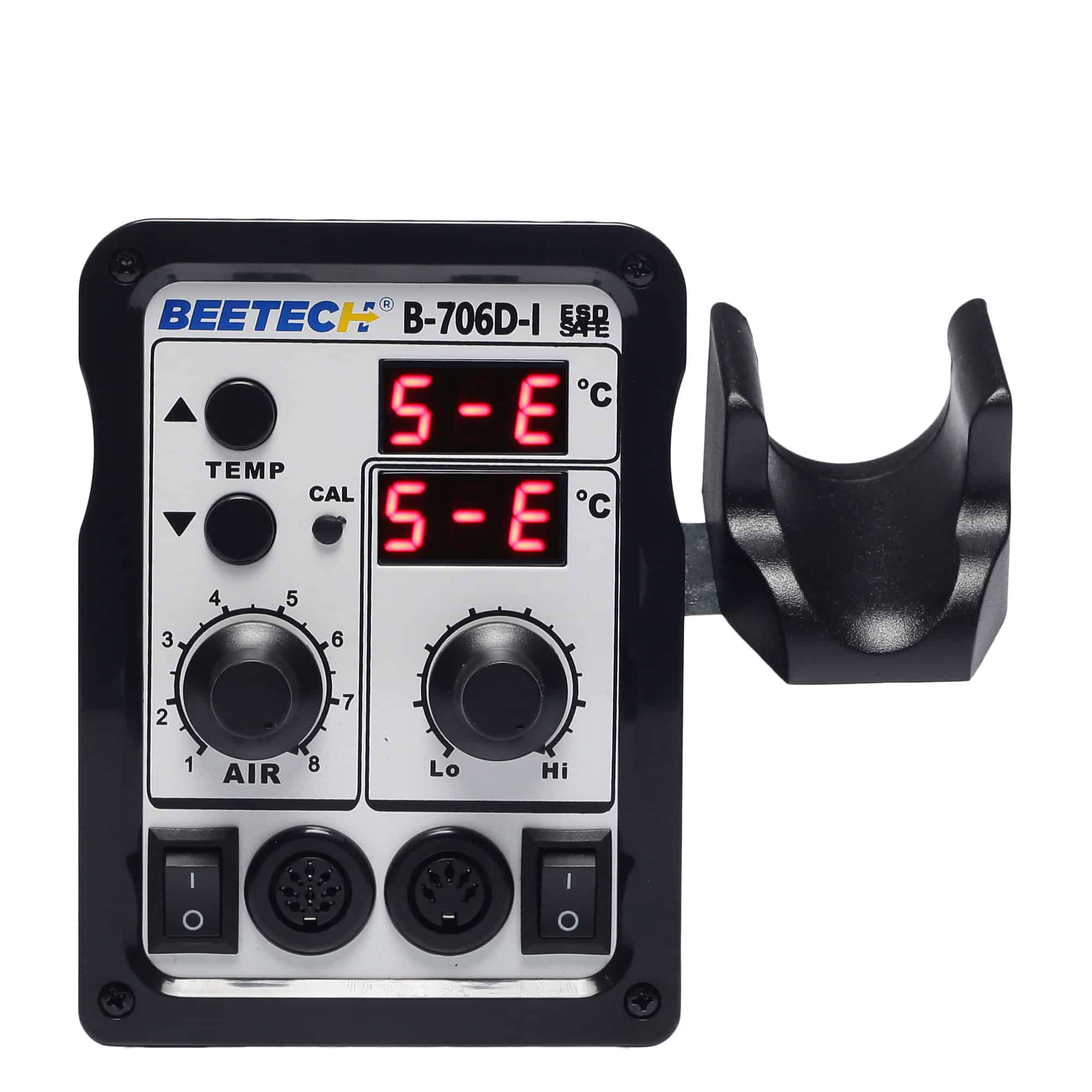 BEETECH B-706D-I 2 in 1 SMD Air Rework Station is a multi functional integrated de soldering maintenance system combined with reworking station and soldering station. The whole unit is controlled by a single microwave chip that ensures accurate temperature and air flow control. This unit has a heater lamp whose lights blinks on and off when the tip temperature reaches the set temperature.